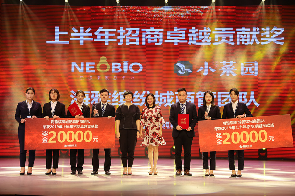 两大品牌华南首家门店的开业,为海雅缤纷城业绩的增长注入了新的活力,也将进一步提升海雅的知名度,而这离不开招商团队的辛勤付出。颁奖现场颁奖典礼上,海雅商业常务副总经理涂雪明,海雅商业副总经理姚晓凤代表公司为两支团队分别颁发了2019年上半年招商卓越贡献奖。