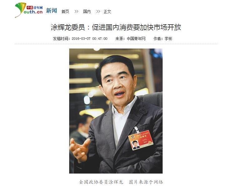 中国青年网——涂辉龙委员:促进国内消费要加快市场开放 2016-03-14